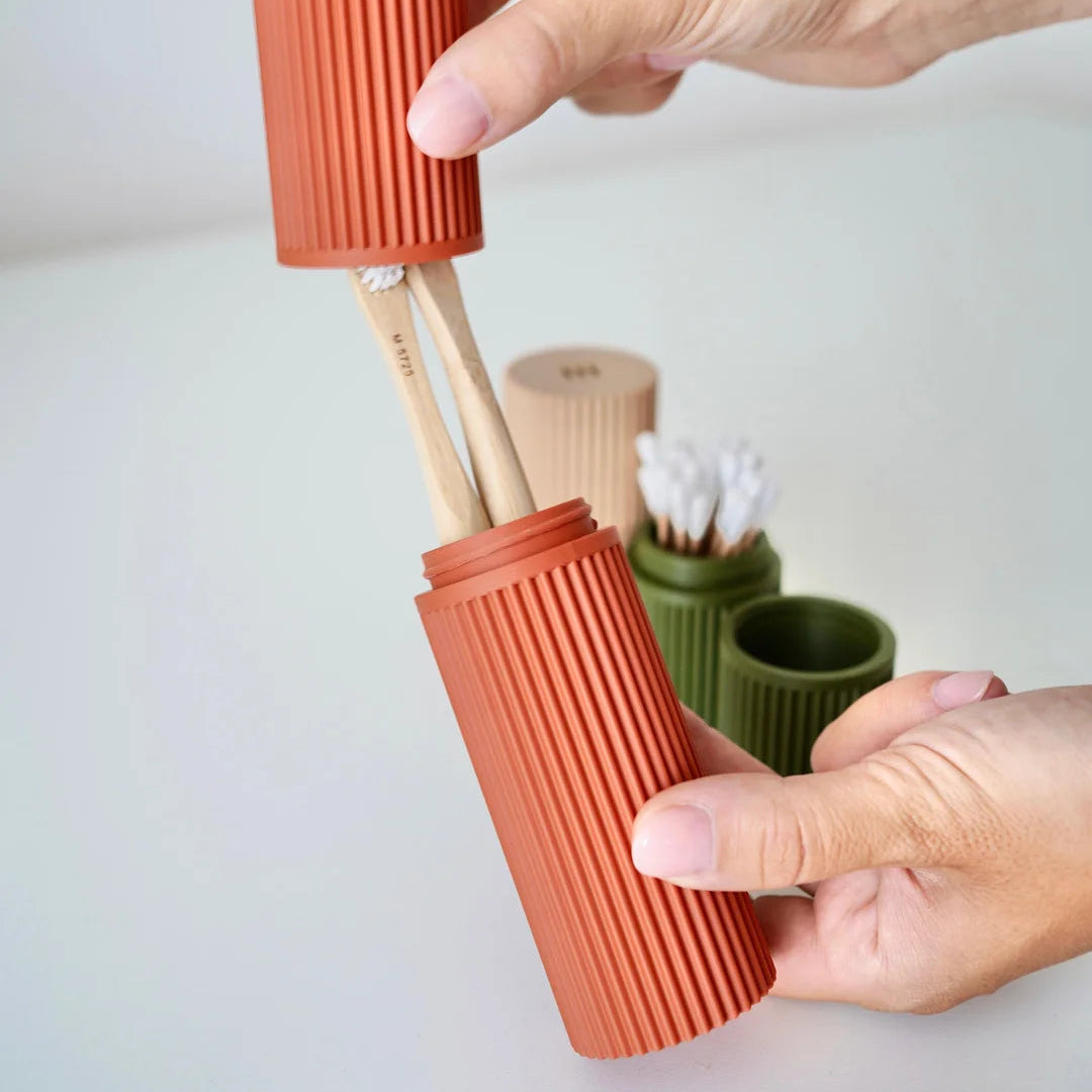 A set of clean, modular holders designed to keep your travel essentials organized - whether it’s your toothbrush, vitamins, or a few small rings you don’t want to lose. Each piece has a soft ribbed texture for a comfortable grip and a calm, functional look that fits right into any minimalist setup.